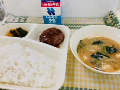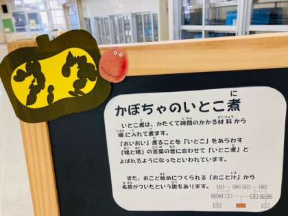 10月20日の献立は「和風ハンバーグ、とうふのみそ汁、かぼちゃのいとこ煮、ごはん、牛乳」でした。かぼちゃのいとこ煮は、かたくて時間のかかる材料から順に入れて煮ます。「おいおい」煮ることを「いとこ」をあらわす「甥と甥」の言葉の音にあわせて「いとこ煮」とよばれるようになったと言われています。また、おこと始めに作られる「おこと汁」から名前がついたという説もあります。