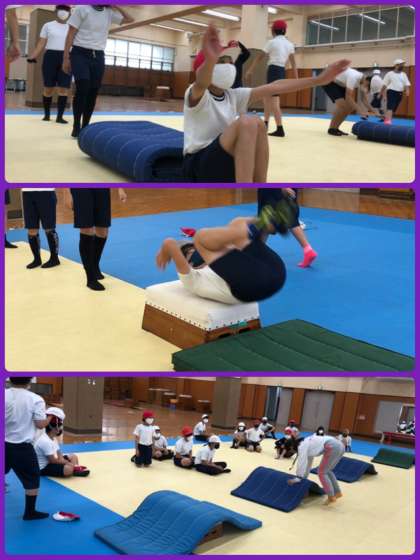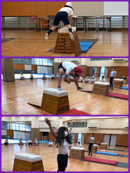 6年生は体育で、とび箱の学習を進めています。台上前転は、柔道場で練習をしてからのぞみました。助走のスピードも意識して、腰を高くあげて回りました。ポイントを一つずつクリアして、美しい台上前転ができるよう、これからも練習していきます。