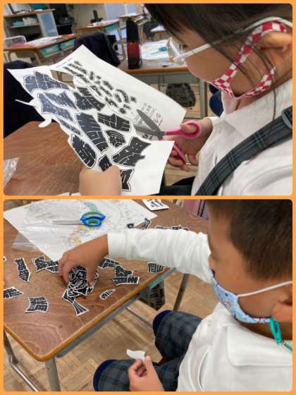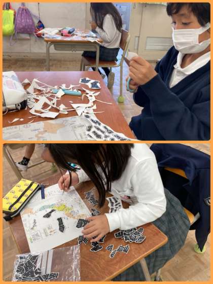 3年生は社会の学習で、都道府県パズルを作りました。形を意識しながら、それぞれの都道府県をつなげていきました。身近にある府県以外も、少しずつ場所や形を覚えてきています。はやく47都道府県をマスターしたいですね。