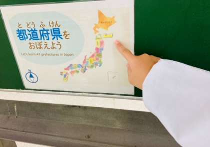 写真は、47都道府県の地図とちいさな矢印に気づく4年生。さすがです!