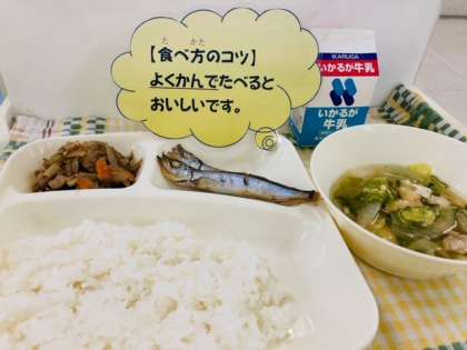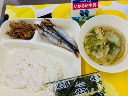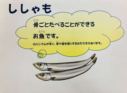 今日の献立は「焼きししゃも、五目汁、きんぴらごぼう、中学校:焼きのり、ごはん、牛乳」でした。給食に使われているししゃもは、カラフトシシャモ(カペリン)と呼ばれる魚です。サンプルケースを見た児童たちは「(魚の目が)こわい〜」「骨もたべられる?」「大すき!」とさまざまな反応でしたが「いただきます」すると黙食。それぞれに一生懸命食べている様子が見られました。