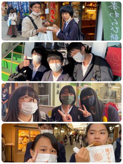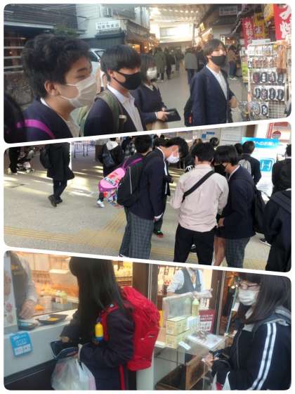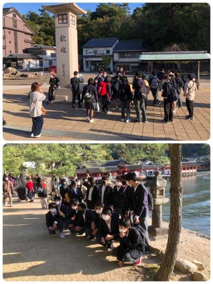 お待ちかねの宮島です。厳島神社を背景に集合写真を撮りました。あとは、お土産を買いにレッツゴー!