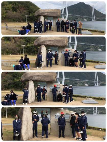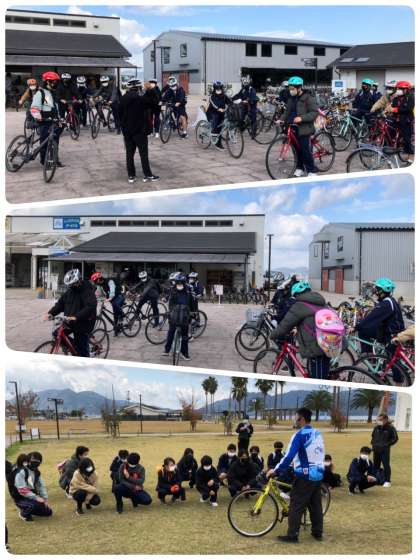 さあ、サイクリング出発です。指導者のお話を聞いて、しまなみ街道へ!