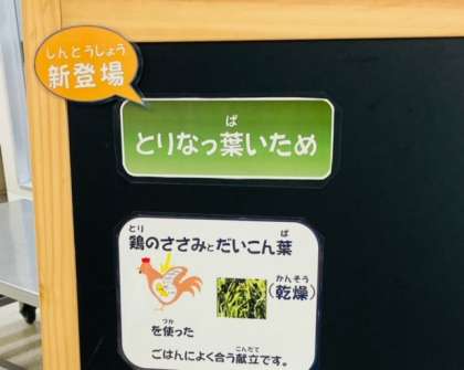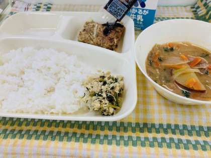 今日の献立は「お好み焼き、豚汁、とりなっ葉いため、ごはん、牛乳」でした。とりなっ葉いためは、鶏のささみとだいこんの葉を使った、ごはんによく合う献立です。だいこんの葉は、カロテンやビタミンCのほか、カルシウムや鉄などを多く含む緑黄色野菜です。