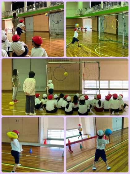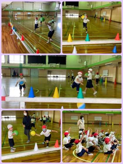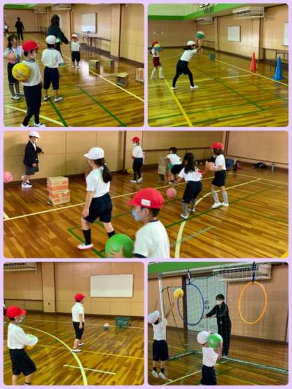 1年生は体育の学習で、ボールを使った運動をしています。この日は、体育館で様々なコーナーを設けて、強く、高く、正確に投げる練習をしました。的をめがけて投げ、うまく当てた時は歓声があがっていました。練習の成果がドッジボールなどにも出ており、投げる楽しさを感じている子が増えています。