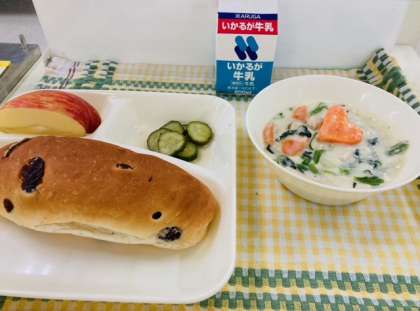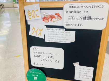 今日の献立は「きのこのクリームシチュー、きゅうりのバジル風味サラダ、りんご、レーズンパン、牛乳」でした。日本には食べられるきのこが約100種類あります。給食には7種類のきのこが使われています。 今日のクリームシチューには、しめじ、エリンギ、マッシュルームを使っていました。