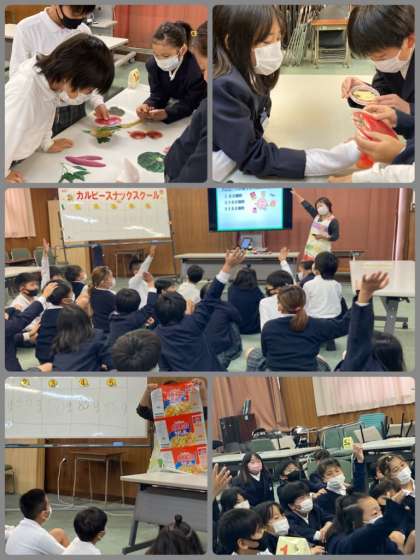 4年生は、カルビーの方にお越しいただき、おやつの目安量や時間、パッケージの見方などを学習しました。班で原料あてクイズにのぞみ、食育に関して理解を深めていきました。