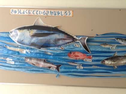 2階の廊下の掲示板が、いつも工夫されています。たべもの教室の先生が、子どもたちに少しでも「食」への興味関心、そして、知識が深まるよう考えてくれています。7月の掲示物は、「小学校給食に出てくる魚たち」それから「おすしのねたをどれくらい知っているかな?」でした。