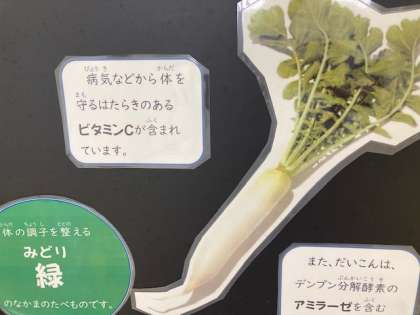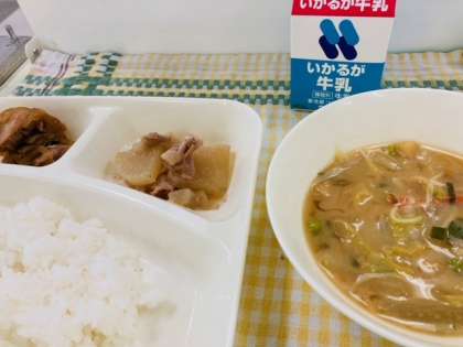 今日の献立は「鶏肉の甘辛焼き、みそ汁、だいこんの煮もの、ごはん、牛乳」でした。だいこんは、病気などから体を守るはたらきのあるビタミンCが含まれています。また、デンプン分解酵素のアミラーゼを含むため、糖質の消化を助けます。