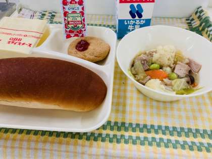 今日の献立は「とうふハンバーグ、カリフラワーのスープ煮、スライスチーズ、黒糖パン、牛乳」でした。カリフラワーには「キャベツの花」という意味があります。キャベツを改良して作られたアブラナ科の野菜で11月〜3月頃にたくさんとれておいしくなります。カリフラワーにたくさん含まれるビタミンCには、傷をなおりやすくするはたらきがあります。