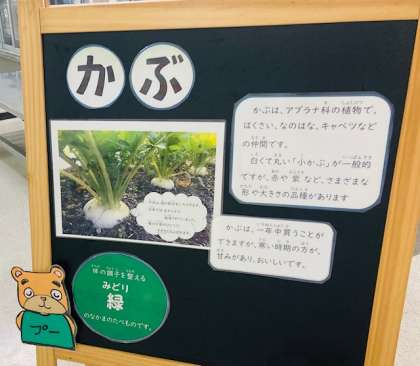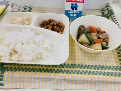 今日の献立は「鶏肉と野菜の煮もの、じゃこ豆、かぶのゆず風味、ごはん、牛乳」でした。かぶはアブラナ科の植物で、はくさい、なのはな、キャベツなどの仲間です。白くて丸い「小かぶ」が一般的ですが、赤や紫など、さまざまな色や形、大きさの品種があります。日本では古くから栽培され、「すずな」ともよばれる春の七草の一つです。かぶは、一年中買うことができますが、寒い時期のほうが甘みがありおいしい野菜です。児童生徒に人気のじゃこ豆とともにおかわりにたくさんの手があがっていました