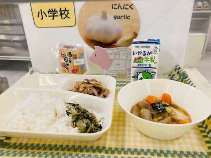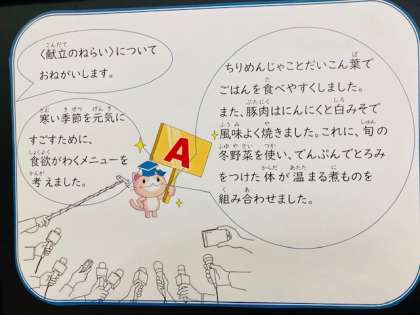 今日の献立は「じゃこ菜っ葉ごはん、豚肉のスタミナ焼き、あつあげと冬野菜のあったか煮、牛乳」でした。「おいしそう!」と好評で、<献立のねらい>を一生懸命読んでいた児童からは「小学生が考えた献立だと思えないくらいすごい!」といった感想がありました。いつか矢田小学校のみんなが考えた献立も食べてみたいです。