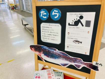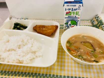 今日の献立は「たらフライ、さつまいものみそ汁、きくなとはくさいのごまあえ、ごはん、牛乳」でした。たらフライに使われているたらは、スケトウダラです。体長は60cmくらいです。身は水分が多く、崩れやすいため、すり身としてかまぼこやちくわなどの練り製品の材料になります。卵巣は塩に漬けて、たらことして利用します。