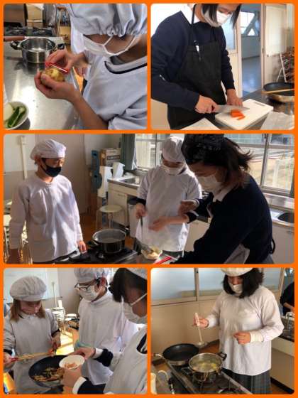 6年生は調理実習で、野菜炒めと、粉ふきいもを作りました。丁寧にじゃがいもの皮むきをして、集中して包丁を使い野菜を切っていきました。そして、火加減を調節しながら、調味料を加えて味を調えていきました。