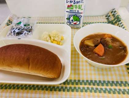 1月13日の献立は「ビーフシチュー、カリフラワーのピクルス、ミニフィッシュ、黒糖パン、牛乳」でした。給食ができるまでには、多くの人がかかわっています。たくさんの人の協力によってつくられていることに感謝しながら、おいしくいただきました。