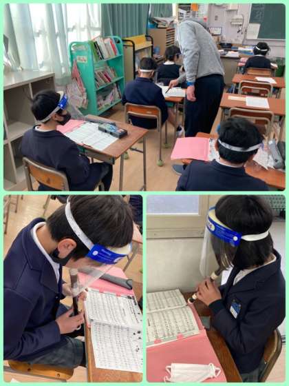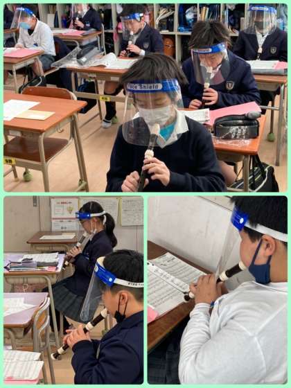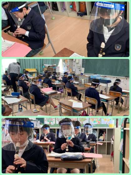 4年生は、3学期に入ってからも、感染症対策をしながらリコーダーの練習をがんばっています。この日は、茶色の小びんを吹きました。美しい曲の音色が廊下にも響いていました。
