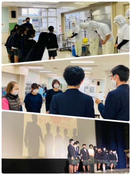 小学校は3年生から中学生は代表からそれぞれ給食調理員さんに感謝状をお渡ししました。児童集会では保健給食委員会がきゅうしょく検定2022を企画しました。