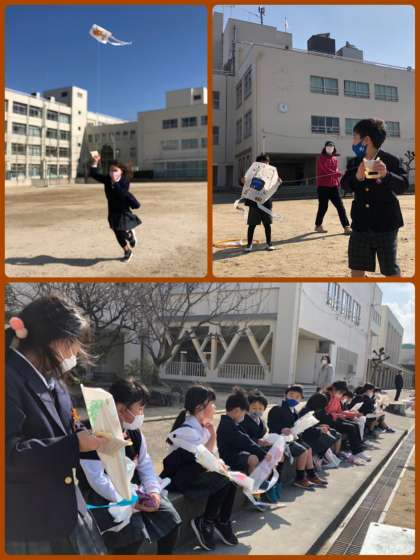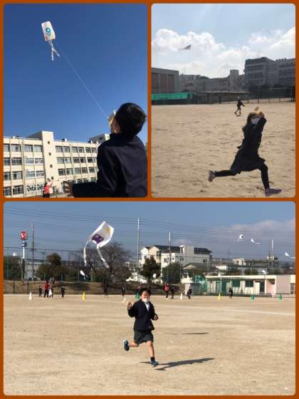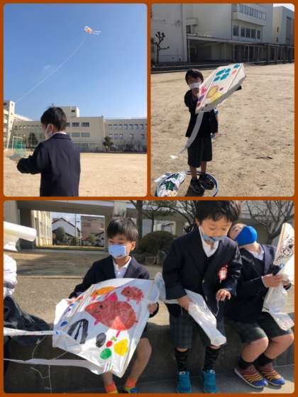1年生は、オリジナルのイラストを描いて作ったたこを、みんなであげました。晴れ渡った空のもと、風をとらえながら高くあげていきました。初めての経験だった子もいたようで、とてもうれしそうな様子でした。