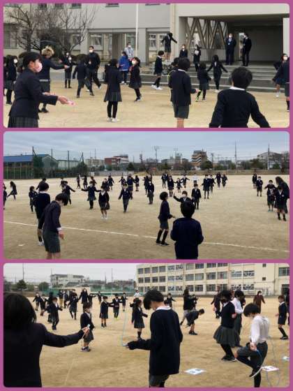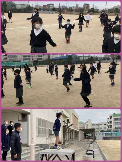 小学部のなわとび集会の様子です。はじめに運動委員が朝礼台で見本を見せてから、全員で一斉にとびました。少しずつ難易度が高いとび方にも挑戦していき、寒空に負けず元気に取り組む様子が見られました。
