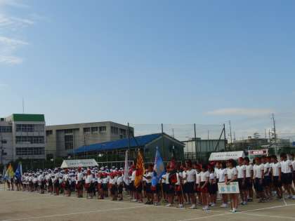 さて、今年も、体育祭に向けて、本格的に動き出しました。子どもたちが決めた今年のスローガンは、「忘れられない最高の想い出を」です。白団の名前が「白神龍」、赤団の名前が「輝炎龍」です。1年生から9年生までが、2つの団にわかれて競技します。たくさんの保護者のみなさまの応援をよろしくお願いいたします。(写真は、昨年度のものです。)