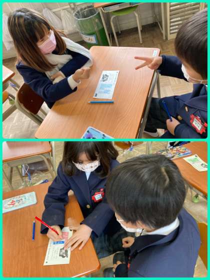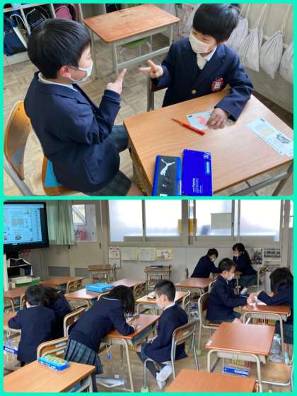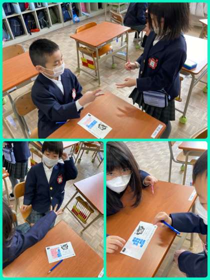 1年生は算数で、じんとりあそびをしました。じゃんけんで勝ったほうが色をぬっていき、最終的に広いほうが勝ちという活動です。面積をますの数で比べ、数が多い方が広いということを確かめました。