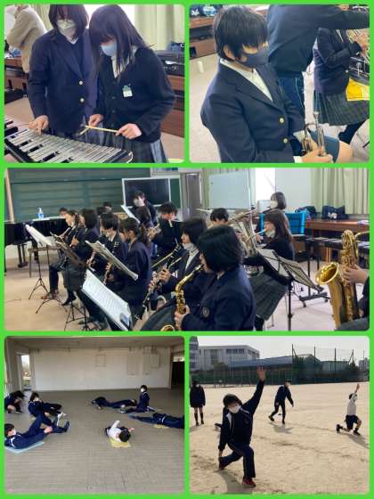 本校には、写真の上から順に、音楽部、陸上競技部、ソフトテニス部、バドミントン部、創作部、バスケットボール部の6つの部活動があります。