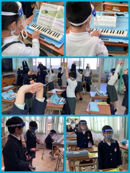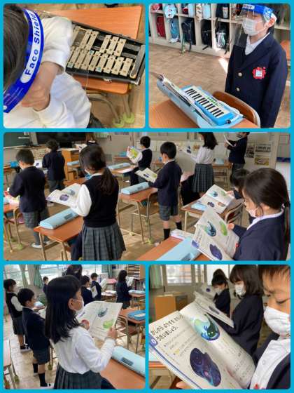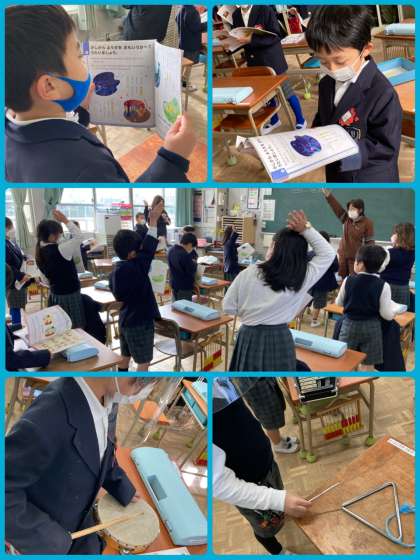 1年生は音楽の学習で、「にじ」の歌と、「こいぬのマーチ」「きらきらぼし」の合奏を練習しています。様々な楽器を合わせながら、上手に演奏することができています。