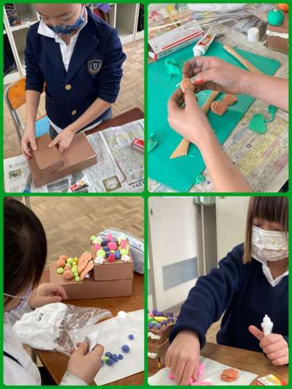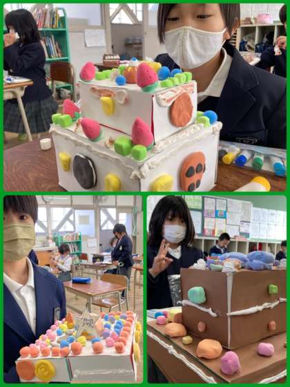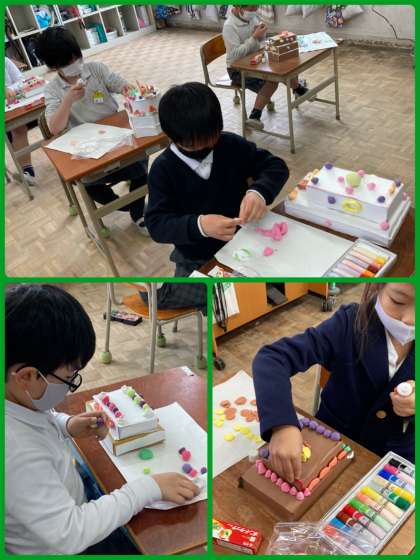 2年生は図工で、重ねた空き箱に粘土で作ったフルーツをのせ、オリジナルのケーキを作りました。絵の具を紙粘土と混ぜて、少しずつフルーツの色に近づけていきました。生クリームやチョコレートなどもイメージしながら、おいしそうなケーキがたくさん完成しました。