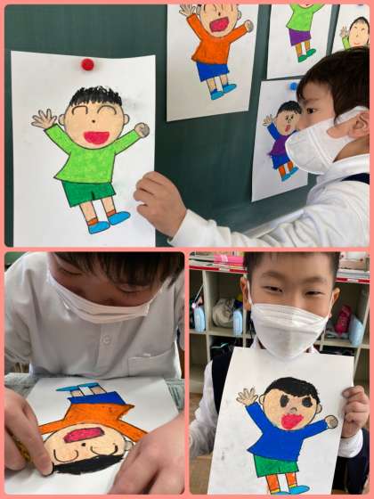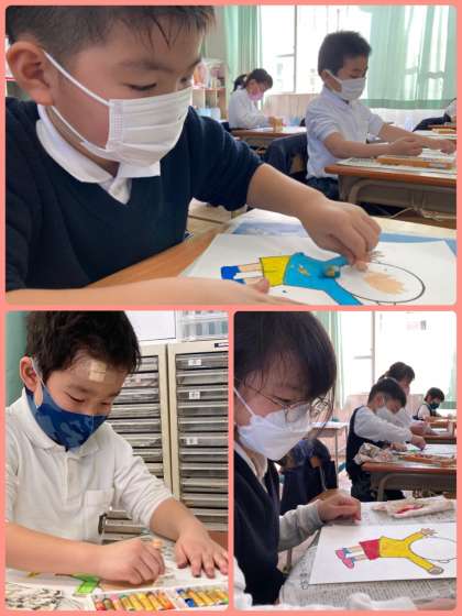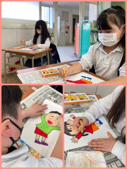 1年生は入学式で、在校生代表として歓迎の演技を披露します。この日は、新1年生の教室に飾る絵を描きました。「学校は楽しいよ」と伝わるように、笑顔の子どもたちをいっぱい描きました。