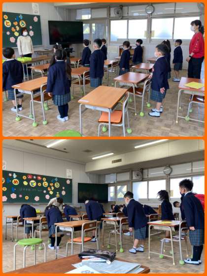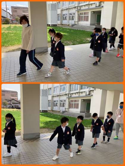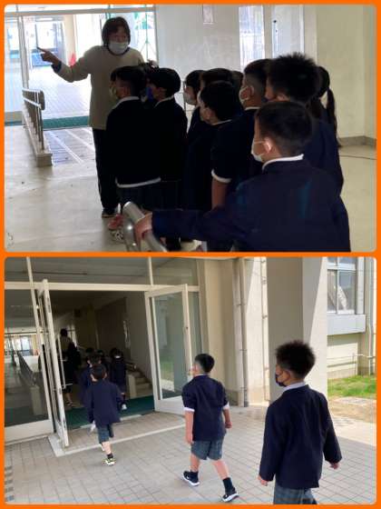 1年生は教室で、正しい姿勢やあいさつの練習をして、学校のきまりを少しずつ学んでいます。その後、学校内を歩いてまわりました。広い校舎に戸惑いながらも、どんな部屋があるのかなと、興味津々の様子でまわっていました。