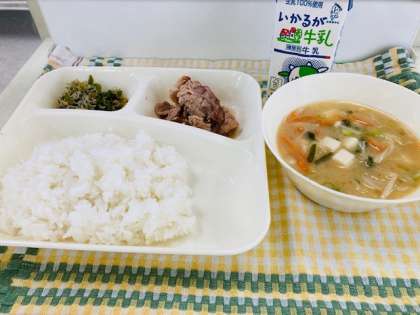 今日の献立は「豚肉のしょうが焼き、みそ汁、じゃこピーマン、ごはん、牛乳」でした。