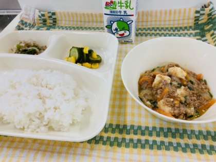 今日の献立は「マーボーどうふ、きゅうりとコーンの甘酢あえ、もやしとピーマンのごまいため、ごはん、牛乳」でした。今日は中華料理です。