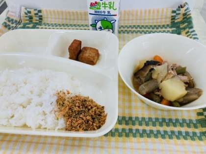 今日の献立は「鶏肉とじゃがいもの煮もの、あつあげのしょうゆだれかけ、紅ざけそぼろ、ごはん、牛乳」でした。紅ざけそぼろは、紅ざけといりごま、あおのりをいって作ります。素材の味をいかすため、料理酒、みりん、うすくちしょうゆだけで味つけした手作りのふりかけです。いりごまと青のりの風味を味わっておいしくいただきました。
