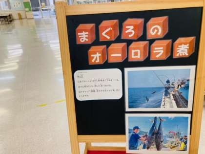 今日の献立は「まぐろのオーロラ煮、豚肉と野菜の煮もの、キャベツの赤じそあえ、中:焼きのり、ごはん、牛乳」でした。まぐろには、おもに体をつくるもとになるたんぱく質が多く含まれています。まぐろの脂質には、血液の流れをよくするエイコサペンタエン酸(EPA)やドコサヘキサエン酸(DHA)が多く含まれています。また、血合い肉には、骨や歯をじょうぶにするビタミンDや貧血を予防する鉄が多く含まれています。