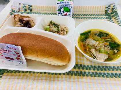 今日の献立は「金時豆の中華おこわ、中華スープ、ツナと野菜のオイスターソースいため、コッペパン、いちごジャム、牛乳」でした。