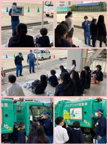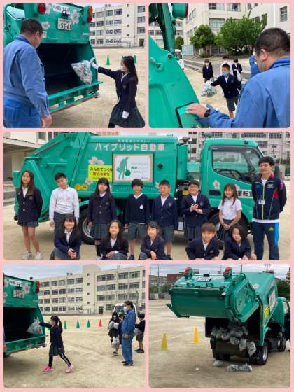 本日4年生は、大阪市環境局の方々にパッカー車で来ていただき、疑似ごみの積込み体験などを行いました。普段近くでは見ることができないパッカー車の迫力を感じながら、収集時に鳴らされるオルゴールの種類なども確認していきました。