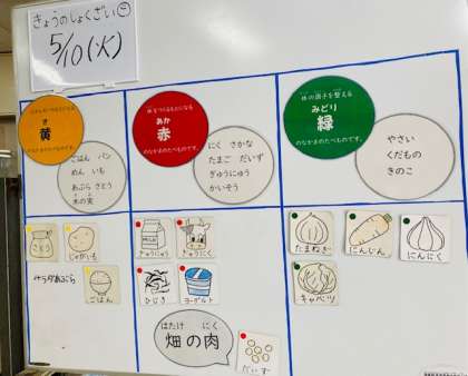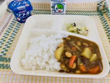 今日の献立は「牛肉と大豆のカレーライス、キャベツのひじきドレッシング、ヨーグルト、牛乳」でした。大豆は、たんぱく質を多く含んでいるので【畑の肉】とも呼ばれています。大豆は、たんぱく質のほかに炭水化物、脂質をバランスよく含み、ビタミンB1、カルシウム、鉄なども含んだ栄養価の高い食品です。