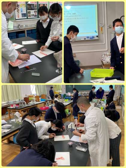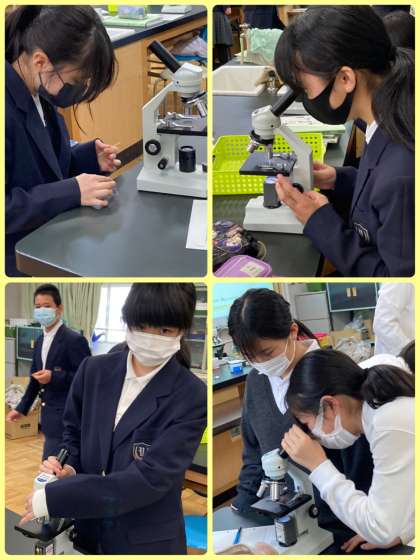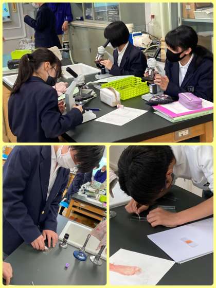 8年生は理科で、植物と動物の細胞のプレパラートをつくり、共通点と相違点を探しました。染色しているものと染色していないものにも分けて、細胞の観察をしました。