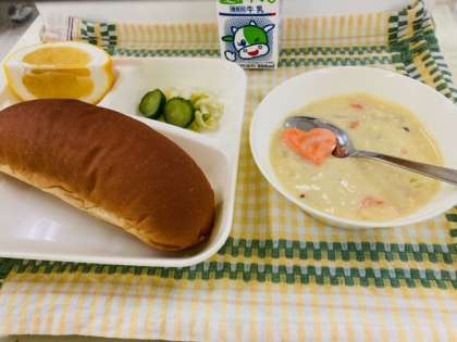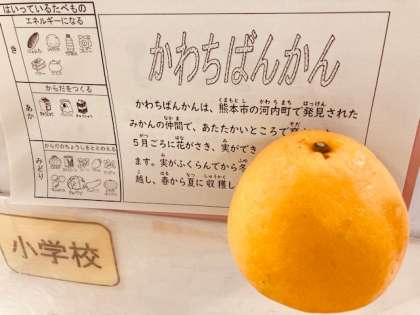 今日の献立は「コーンクリームシチュー、キャベツときゅうりのサラダ、かわちばんかん、黒糖パン、牛乳」でした。 かわちばんかんは、熊本市の河内町で発見されたみかんのなかまです。別名「和製グレープフルーツ」さっぱりジューシーな味わいが特徴です。