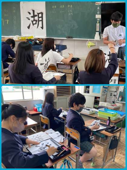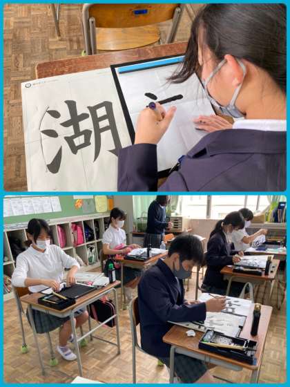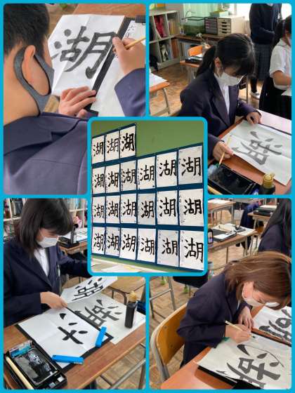 6年生は書道で「湖」の字を書きました。とめ、はね、はらいをしっかり意識しました。これから先、難易度が高い字にも挑戦していきます。