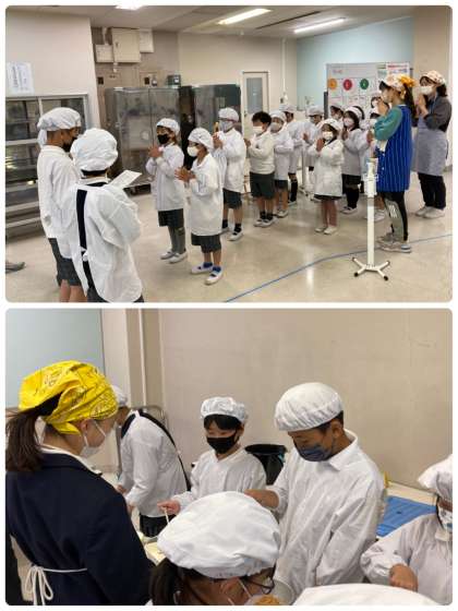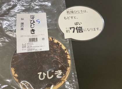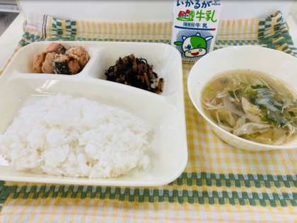 今日の献立は「さけのごまみそ焼き、五目汁、ひじきのいため煮、ごはん、牛乳」でした。ひじきは、わかめやこんぶと同じ海そうのなかまで、カルシウムや食物繊維などを多く含む食品です。給食では、乾燥ひじきを水でもどして調理します。今日は、にんじんとうすあげが入ったひじきのいため煮をいただきました。