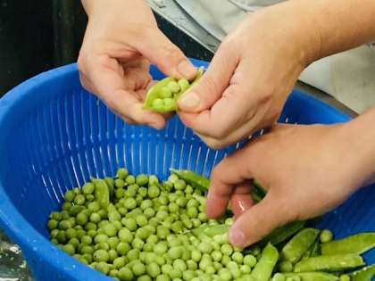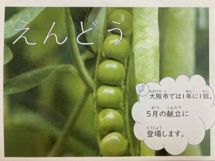 一般的にグリンピースと呼ばれている種類の豆ですが、冷凍や缶づめとは違い、関西では豆ごはんや卵とじなど、様々な料理に使える春野菜として親しまれています。4月下旬から5月下旬が旬です。