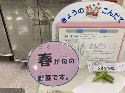 今日の献立は「あかうおのしょうゆだれかけ、みそ汁、えんどうの卵とじ、ごはん、牛乳」でした。旬の食材【えんどう】は、さやから取り出し、鶏ひき肉を加えて、おだしの効いた卵とじにしていただきました。卵の個別対応献立でした。