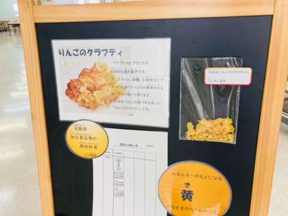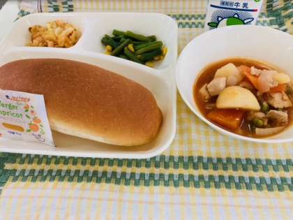 今日の献立は「ケチャップ煮、さんどまめとコーンのソテー、りんごのクラフティ、コッペパン、牛乳」でした。クラフティは、フランスの伝統的な焼き菓子です。卵、クリーム、砂糖、小麦粉などで作った生地にたっぷりの果物を加え、オーブンで焼いて作ります。今日はりんごの缶づめを使った「りんごのクラフティ」でした。