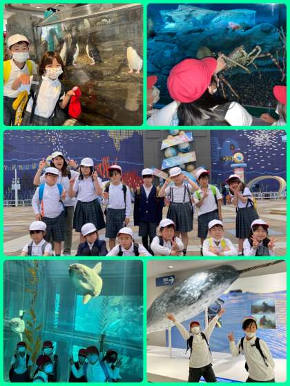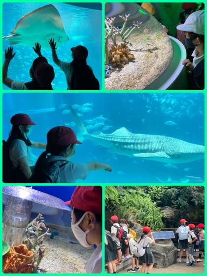3・4年生は海遊館へ行きました。3年ぶりの春の遠足の実施となるので、3年生にとっては初めて電車に乗って出かける行事となりました。行く前から、見たい水生生物を友達どうしで伝え合っていました。目の前で見るジンベエザメの迫力には、みんなが圧倒されていました。