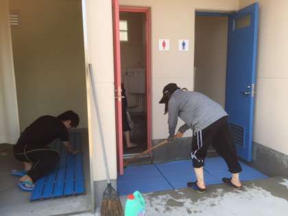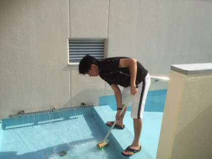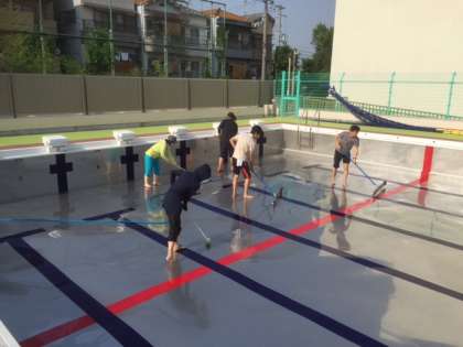 来週15日から待ちに待ったプール水泳が始まります。今日は、みんなが気持ちよく泳ぐことができるように小学校の先生方でプール清掃をしました。プールの中だけではなく、トイレや更衣室も清掃しました。