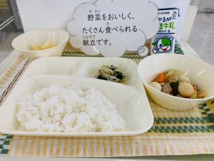 今日の献立は「八宝菜、チンゲンサイともやしのしょうがあえ、パインアップル(缶づめ)、ごはん、牛乳」今日の八宝菜には、豚肉、うずら卵、たまねぎ、キャベツ、にんじん、たけのこ、ピーマン、しいたけの8種類の材料が使われていました。