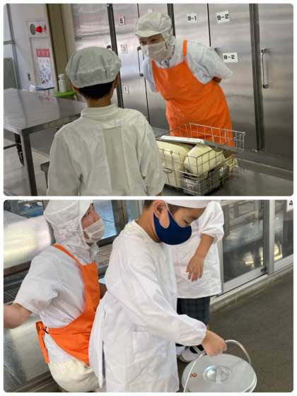 調理員さんに学年を伝えて、食器や食缶をゆっくりと運びました。