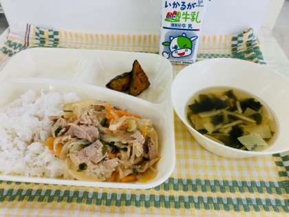 今日の献立は「豚丼、湯葉のすまし汁、かぼちゃのしょうゆ焼き、牛乳」でした。