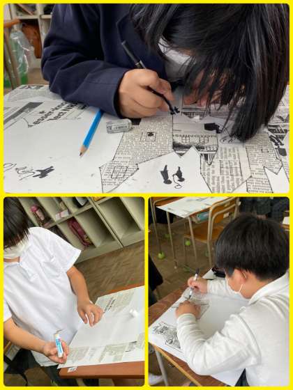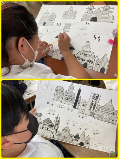 5年生は図工の学習で、英字新聞を切り貼りして、自分がイメージする異国の夜の町を作っていきました。家のつくり、町の人々や道路の様子など、趣向を凝らしながら完成させていきました。